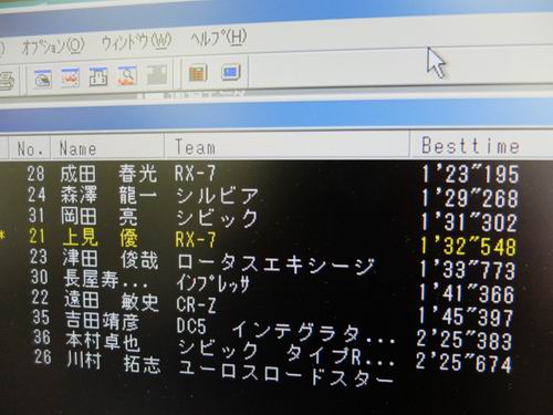 昨日から続いている コースレーコード更新2Day の2日目でとうとう出ました\(^o^)/ 更新したドライバーは・・・。 成田春光選手 FD3S RX-7 タイム 1分23秒195昨日(11月23日)もコースレコード狙いで走行していたがアタック中の2Lap目? でミッショントラブルにより更新も逃していたが、往復6時間に作業40分を費やして本日(11月24日)に再度挑戦した結果見事に更新! マシンメンテナンス&セッティングを行っているワタヤワークスも肩の荷が下りた事だろう!