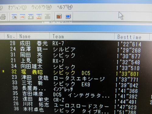 でちゃいました! コースレーコード更新です。 ほんのチョット前に 「22秒出るかも・・・」 なんて言っていたら、本当に出ちゃいました! 素晴らしい! 最高の走りをありがとう\(^o^)/◆クラブマンコース FR-TCクラス 更新ドライバー 成田春光 FD3S RX-7 タイム:1分22秒614 ◆クラブマンコース レコード樹立の瞬間・・・ 計測モニターですが・・・。