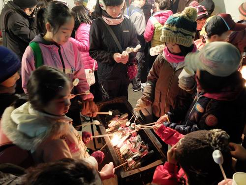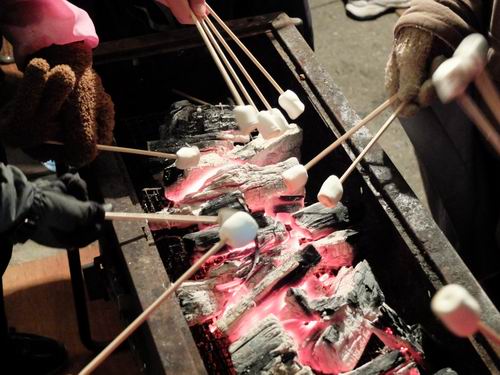 子供たちにマシュマロ焼きをプレゼント! みんなはマシュマロ焼きって知っていますか? 自分は初体験で 「美味いのか?」 とブツブツ言いながら割り箸にマシュマロをさしていましたが、子供達には大人気だったようで配布スタートから僅か15分で第1弾終了。