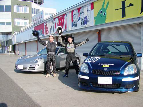 本日最後のスポーツ走行枠に駆け込みで来られたお二人、S野さん親子。 息子さんはJAFのレースに参加される等サーキットの常連さん。 お父さんは昨年のECOエコワンタンGPに参加され、サーキット走行が楽しくなったようで今回が4回目。 本日、息子さんはヴィッツレースの練習。お父さんは7月のエコGPの練習?一緒にコースイン。 数周は一緒に走るのかとカメラを構えて待っていましたが、1周目から息子さんは全開だったので2台並走シーンは撮れず。 でも、最後の方は「ライン取りがなってない」と息子さんがお父さんを引っ張って走ってました。