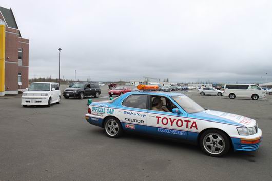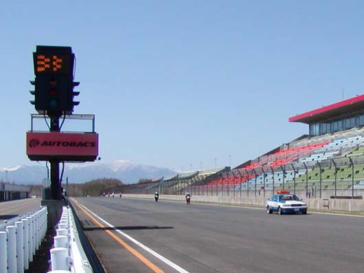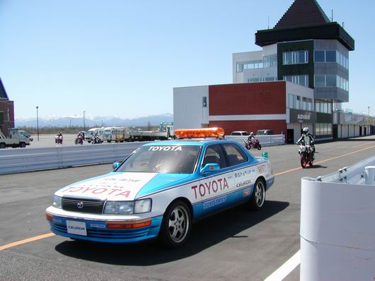 5月5日の午前中は「サーキット体験走行」を実施。 車でもバイクでも参加OK。 参加料は無料(入場料が別途かかります)。 体験走行の時間が近づいたら、放送が入ります。このようにセーフティカー(先導車)の後ろに車両を付けて下さい。