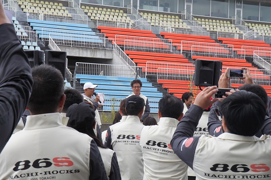 とうとうこの日がやってきましたね。 参加受付後、レーシングドライバーによるウェルカムランで『86S J005 TOKACHI』が始まりました。開会式では、「平日の金曜日に、こんなにたくさんの参加者が北海道の十勝に集まるなんて信じられない!」とMCピストン西沢さんの一言