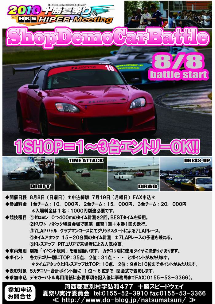 十勝夏まつり&HKSHIPERMeetingでも目玉イベントなのがこの ”ショップデモカーバトル” だ! ショップの方々で ”うちは出るぞ!” というショップを募集中! 「うちのお店はゼロヨンでTOPとるべさ~」とか・・・ 「うちのお店はぷちレースでTOPとるべさ~」など、お店の特色を出してほしいんです。 5種目合計でTOPを獲得するのがBESTかもしれないけど、お店のカラー(特徴)をギャラリーの方々にアピールしてほしいイベントなんです。 現在のクルマ業界は ”なにがヒットするかはわからない・・・” と言われているので、ショップデモカーバトルに参加して、ギャラリーの心をつかんじゃいましょう! イベントの詳細はホームページTOP 「十勝夏祭り&HKSHIPERMeeting」にアップしてあるから見てね!