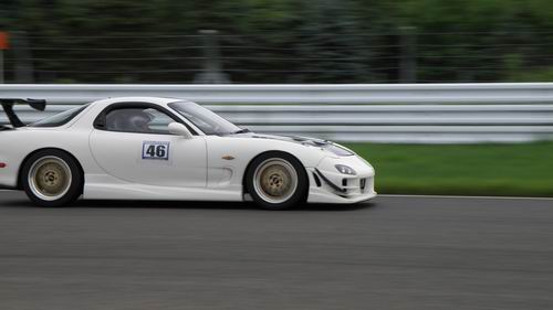 「おれ達3台で走ってくるから写してね・・・」 とつぶやいてコースインしたこの3台! 「いったいど~やって走ってくるんだい?」「なにを写せばいいんだい?」とブツブツつぶやいていたら、なんと3台横並びでストレートを立ち上がってくるではないですか・・・。 「おいおいおい、そんなに広がったら写せないってばヨ!」と思い逃げの一枚がTOPの写真! 「もうちょっと寄ったら・・・」なんて考えていたらこのお3方はフル加速してくるから、構図&ピント間に合わずこの2台の対マンゼロヨンのような写真に・・・。戻ってきたお3方からは・・・ 「xxさん踏みすぎ、出遅れたもん・・・」 「いやいやレースだから・・・」 「ちゃんと写してくれたかな~・・・」 となんとも幸せな会話をしていたので、プロのカメラマンでもないのに 「もうちょっとちゃんと写してあげよう・・・」と思ってしまった。 3台を写すはずが2台しか写せなかったのでサービスカットとして・・・