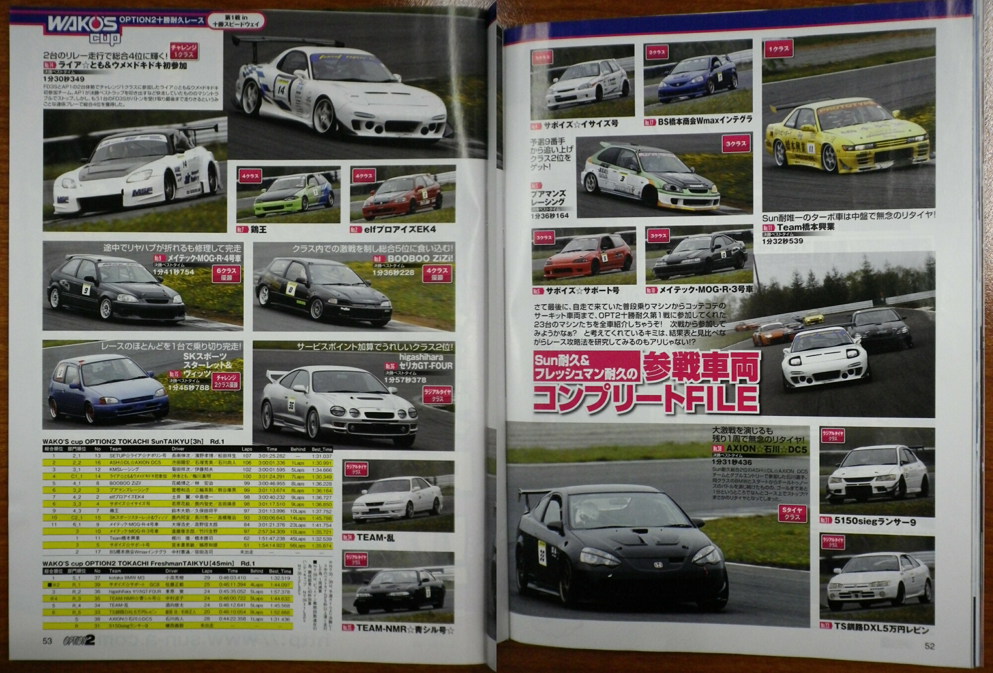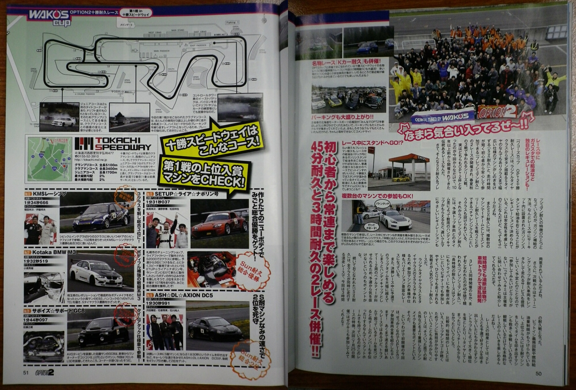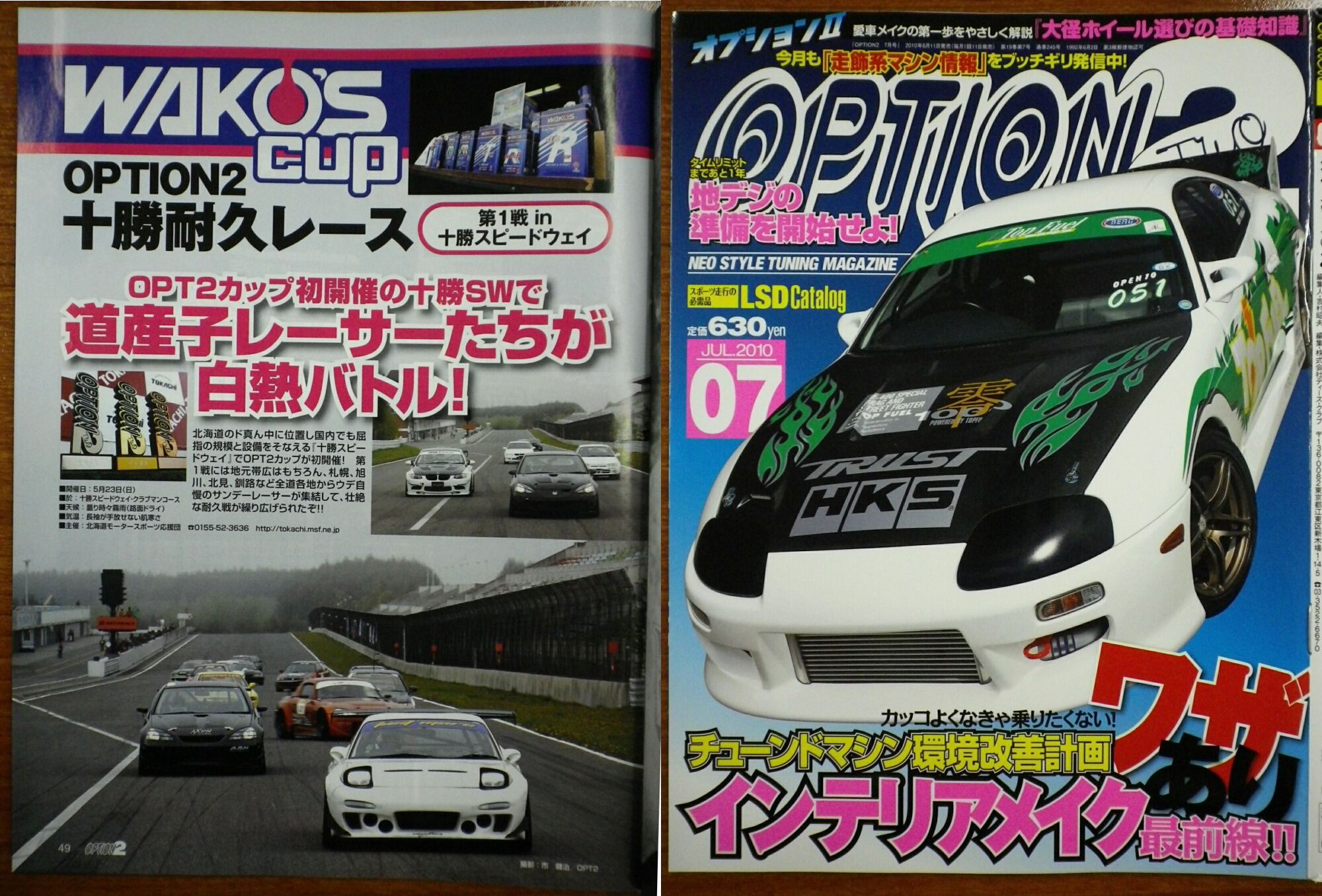 (写真は2010年7月号) 5月23日に行われた「WAKO'S CUP OPTION2耐久レース 第1戦」が掲載されました。 来たる8月15日の第2戦もOPTION2の取材がありますので頑張って下さい! 第2戦が掲載されますOPTION2は9月11日に発売されます。 まだまだ参加者募集中! 十勝Sun耐&フレッシュマン耐久申込用紙 軽自動車耐久申込用紙