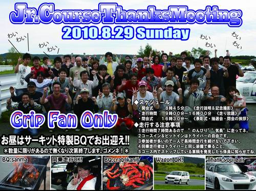 ジュニアコースファンのみなさま・・う・ 大変お待たせいたしました! 8月29日(日曜日)に ”ジュニアコースファン感謝祭≪サーキットでBQ≫” のお誘いです! 毎回タイトル名が違っちゃって 「どれが正解よ・・・!」と言われるんですが、どれも正解! よ~わ ”みんなに楽しんでほしいイベント” っていう名称であればなんでもOKさ! でも、今回は ”GRIPユーザー”の為の感謝祭だから、DRIFT走行はおあずけ! 今年もサーキットオリジナルBQでみんなにご奉仕するので楽しみにしてね! もちろん差し入れ大歓迎! 「ちょっとこれ焼いて・・・」なんてのも大歓迎! ただ、子牛の丸焼は無理! 情報提供が遅れて申し訳なかったけど、ここからはみんなの連絡網もで広めてくださいね! 広める情報はこうだ・・・ ”8月29日はジュニアコースでBQだ!” って事で・・・。 情報はここにアップしてあります⇒ ”ジュニアコースファン感謝祭≪サーキットでBQ≫”