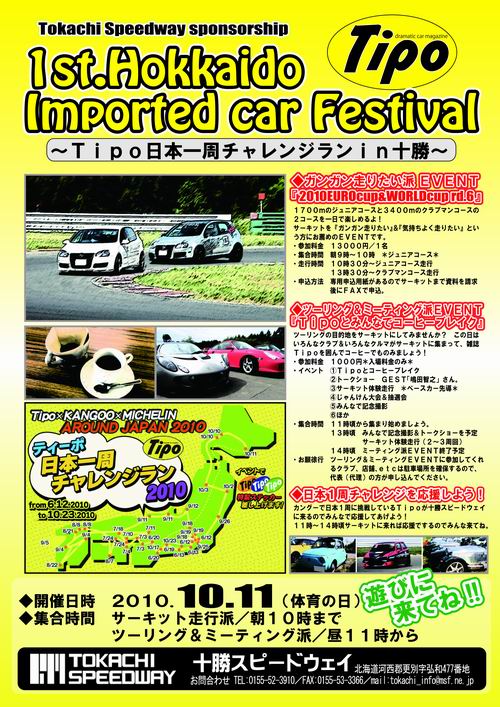 祭りだ! 祭りだ! 3回目の祭りだ!! 秋まつりではなく”外車のお祭り”だ! 「秋だから ”秋祭り”でもあろうかな~」ってベタな事を考えていたんだけど、Tipoさんが『日本一周チャレンジラン』の企画で当コースに来てくれる事になったので、そのイベントに便乗させていただきました(*^_^*) ご存知の通りTipoは外車の本(勝手にそ~思っています)だから ”外車を集めよう!”・・・ ただ集めてもつまんないから ”お祭り”に・・・ という事で決まった名称が 【1st.Hokkaido Imported car Festival】だ! なんだか聞き覚えがあるイベント名称ですがいい~んです。覚えやすいから\(^o^)/ イベント詳細やらなんやらかんやらは随時アップするのでお楽しみに! みんなで10月11日(体育の日)はサーキットに遊びに来てね!!