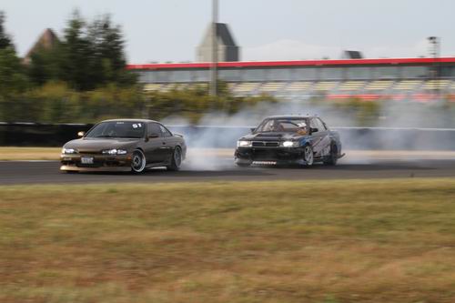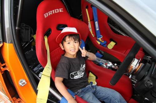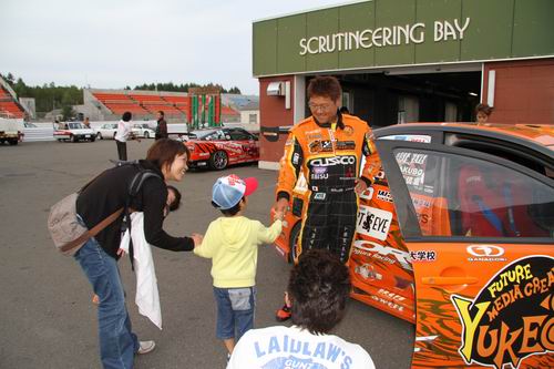 やりました~!! クラブマンコースでのドリフト大会!! やってみるものですね~・・・。 なんて言うのかな?? 簡単にいえば・・・ 楽しかった~!!背景にクラブマンコース(サーキット)の象徴でありメインスタンドが見えるでしょ! ここは4コーナーです。 ゲストで参加してくれたチームオレンジの熊久保さんは子供たち(若い奥様たち)に大人気。