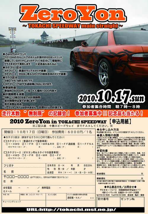 いつもいつも急にきまるのがこのイベント!!! そ~です ゼロヨンイベント です!! 今回は名称を新たに 「2010 ZeroYon」にしてみましたがど~ですか? そのまんまでわかりやすいしょ\(^o^)/ イベントの概要はホームページ内にアップしたのでそこを見てね! ≪2010ZeroYon≫ ゼロヨンイベントでは珍しく ”参加賞” も準備するから、みんなで参加してね! まってるよ~\(^o^)/