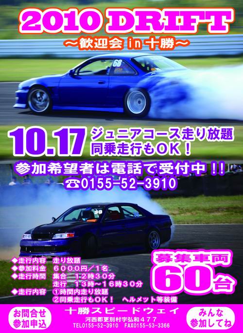 お電話ありがとうございました・・・(;一_一) すっかり案内を出す事を忘れていたドリフトイベントを紹介します!! 意外と今年のドリフトって盛り上がったよね? そ~思っているのは自分だけ? 5月の年齢別はヤング(死語)が沢山参加してくれたし・・・ 6月のD1dv北海道だって結構来てくれたしょ・・・ 8月の夏祭りは例年どおりに満員御礼出たし・・・ 9月初開催の大逆走もD1マシン&熊久保氏の来場&ドリフター多数参加でたのしかった・・・ ねっ、盛り上がったでしょ? やっぱドリフトって凄いんだね(*^_^*) と言う事で雪が降る前にドリフターに感謝の気持ちを込めて ”歓迎会” を開催するので、みんなで遊びに来てね! 今年も ”同乗走行OK”の格安料金にしているから ヨロシク!! イベント詳細はホームページにアップしたからそっちを確認してください。 みんな来てね~!