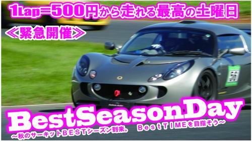 サーキットユーザーには最適の季節になってきたので、10月23日(土曜日)にこんな企画を緊急開催しますよ! 題して・・・ 「2010BestSeasonDay ~秋の土曜日大感謝Day~」だ! イベント詳細はここ ≪BestSeasonDay≫ を見てもらうとしよう\(^o^)/ でも一番の注目点はなんといっても平日大人気だった ”1Lap=500円” を土曜日に初めて実施できることだ! これで 「1周しか走ってないのにお金とられた~・・・」って愚痴もないべ? 500円ならそんなに愚痴ンないべ?? なんにしろ緊急開催なのでみんなには ”DM” を送る時間もないから、横のつながり(ネットワーク)で情報を伝達してね! では 10月23日(土曜日) まってるよ~\(^o^)/。