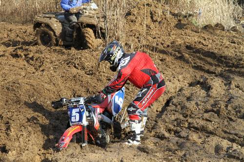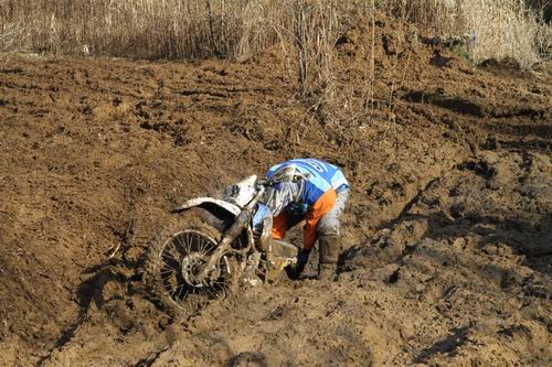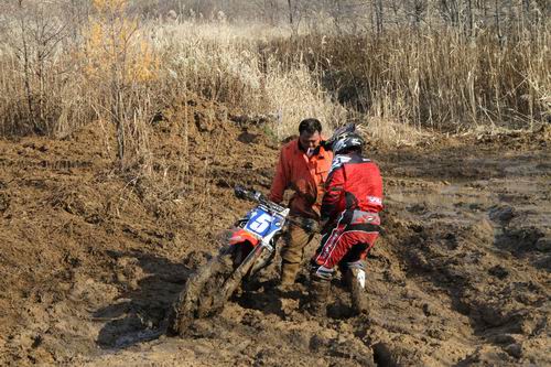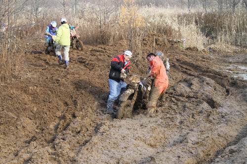 このお父さんに大感謝です! 今回の初雪エンデューロコースは ”昨年ほど難コースでない” と思っていたので、あまりスタックする場所は無いと思っていたら、こんな事になっていたとは・・・。ここは ぬた場 の後半の部分で、実はコース作成中にタイヤショベルが95%埋まった場所なんです。 昨年もこの場所でスタックマシン続出したので、少しコースを広げたので安心していたんですが、コース右側にショベルがハマった落とし穴があって 「ここは走らないでね・・・」 と願っていたのですが、こ~なっているとは・・・。 反省。 でも、ここに登場したのがオレンジつなぎを着たお父さん。