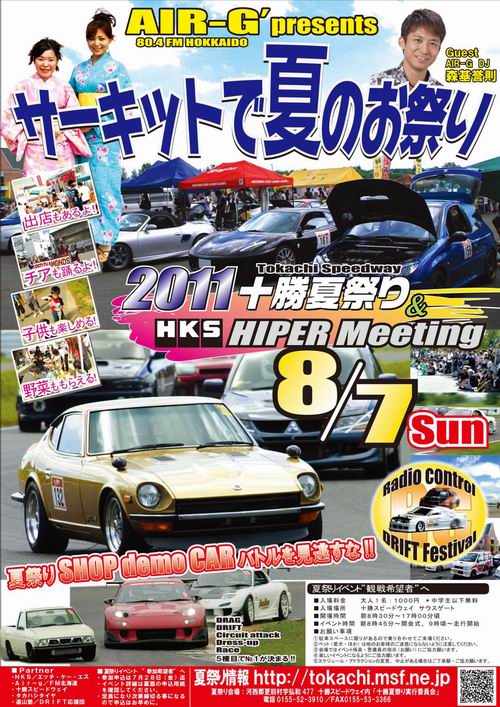 またまたこの日がやってきます! そ~です 十勝夏祭り&HKSHIPERMeeting です!! 今年も HKSさんのご協力をいただいて開催するので楽しみにしてね! そして今年の最大の目玉は・・・ なんと~ Air-G(FM北海道)さん も協力してくれる事になったので何時の日かFMから 「サーキットの夏祭りに遊びに行こう!」って聞こえてくるので楽しみにしてね!! 夏祭りの開催日は 8月7日(日曜日)だ! みんなで走りに来てほしいし、観にも来てほしい! イベントの詳細は随時アップしていくの楽しみにしてね! では・・・