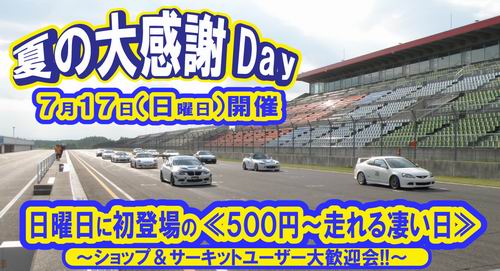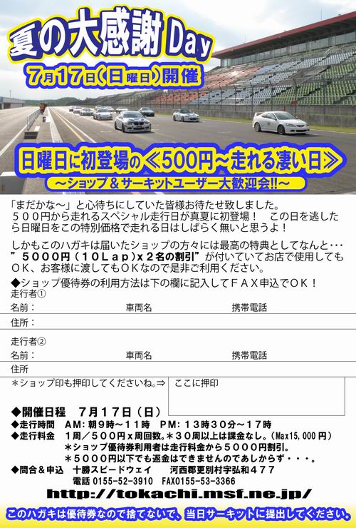 「まだかな~」と心待ちにしていた皆様お待たせ致しました。500円から走れるスペシャル走行日が真夏に初登場! この日を逃したら日曜日をこの特別価格で走れる日はしばらく無いと思うよ! しかもショップの方々&チューニングショップに出入り? しているサーキットユーザーの諸君&デビュー間近の皆様にサーキットからとっておきをプレゼントしちゃいます! なんと・・・ ショップ優待券(ハガキ)をハガキでどど~んと送っちゃいま~す! 優待ハガキはこんな感じだよ!このハガキを道内のタイヤ販売店、チューニングショップ、サーキット走行してくれている中古車販売店など全部で約270店舗に明日(7月7日の七夕)送付するので、お店の方を誘って遊びに来てほしいな! 「おいおいおい、俺達も忙しんだぞ~」というショップの方々が多いと思うので、この優待ハガキはショップユーザーの方々も利用する事ができるようにしているので、お店の親方の承諾があれば借りてきてもOK\(^o^)/ ≪夏の大感謝Day≫ ◆開催日程 7月17日(日曜日) ◆走行時間 AM:9時~11時 、 PM:13時30分~17時 ◆走行料金 1Lap/500円x周回数=走行料金 *30Lap以上は課金なし* ◆計測料金 プリントアウトが必要な方は 2000円 必要です。 ◆優待券について ①各ショップに 5000円(10Lap)x2名 の優待券あり。 ②利用はショップで使用してもユーザーが使用してもOK。 ③申込はお店に送ったハガキに必要事項を記入してFAX(0155-53-3366)でOK。 *優待券の利用方法の詳細はサーキット(0155-52-3910)に電話してね。 最近ちょびっと暑い日が続いているけど、夏ですから暑い日差しの中でもサーキットを楽しんでくださいね! もしかしたらスンゴイ事になるかも知れないしね(*^_^*)