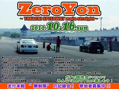 「お~いまだですか~・・・」とか「やるんだべな?」とかいろいろとお問い合わせを頂いている ZeroYonイベント の案内をやっとする事ができます。 遅くなってごめんね~((+_+))。 開催日は 10月16日の日曜日に参加料金 6000円 で開催します。 イベントの詳細は ホームページ内の イベント案内 にアップしたので見てね! 申込用紙はそのページの最下部に PDF で申込用紙をダウンロードできるので、Zeroyonイベントへの参加希望者は記入して FAX(0155-53-3366) してください。 FAXの後はイベント当日に 朝7時~8時 に サーキットの PIT7番~16番PIT に集合! そして 18PIT横の事務所で受付をしてください。 たぶん北海道で開催のZeroyon最終日になるような気がするので、みんなで遊びに来てくださいね!