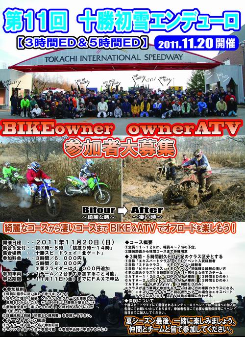 お待たせいたしました! 本当~にお待たせいたしました!! オフロードファンが夏シーズン最後を締めくくるイベントとして定着?しつつある 十勝初雪エンデューロ の情報ですよ\(^o^)/ 今年で初雪エンデューロも11回目を迎える事ができました。 11年前といえば・・・ みんな若かったね~(*^_^*) 初開催の写真でも見つけてアップしてみようと思ったけど、今と違って ネガフィルム なもので写真の発見ができませんでした・・・ 残念。 今年も例年通りにサーキット施設内全域を使った豪快な特設コースを作成するので楽しみにしていてくださいね! ◆開催日 11月20日(日曜日) ◆走行時間 3時間ED&5時間ED ◆参加車両 オフロードBIKE & ATV(スポーツ&4WD) 参加申込用紙&イベント概要は近日中にアップするのでもうちょっとだけお待ちください。 今年もこんなコースになるのかな???