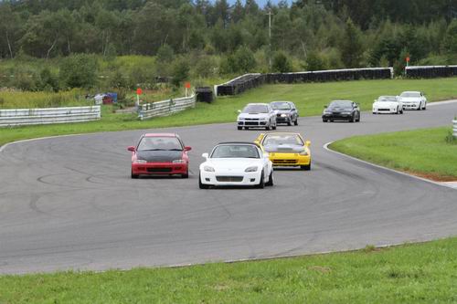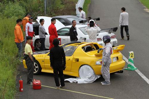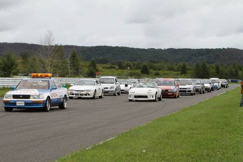 ペースカーは40km/h~60km/hの間でゆっく~りと20分間参加者を先導します。 参加者はこの20分間の間に全ドライバーが練習&コースの確認を兼ねて PITイン&ドライバー交代 をしなければならない。 ということで朝一番は通勤ラッシュ並みにPITは大混雑。