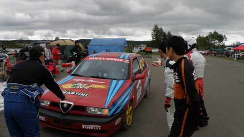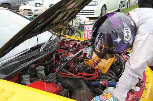 シビックで参加してくれた №80CRAZY☆CIVIC はま~賑やか! 「若者っていいよね・・・」と参加者のおじさま方と語り合っちゃたもんな~・・・。 ゴールまで目指して頑張ろうね! そ~そ~・・・ このジュニ耐ではVTECエンジンだけに特別なハンディーがあって、№80CRAZY☆CIVICもシビックで参加だったから事務局的には シビック=VTECエンジン という図式が立っていたので№80にも -15LAP のハンディを課していたら 「うちらのエンジンVTECないよ!」 との申告がありエンジンルームを覗いてみると・・・ VTECが無い・・・ 当社のファイヤーカーのシビックシャトルに搭載されている キャブエンジンに似ている。 ということでハンディー無しでゴールを目指すことになりました。 という感じで記念撮影をしている間にスタートの時間になりペースカーが20分間のローリングを開始!