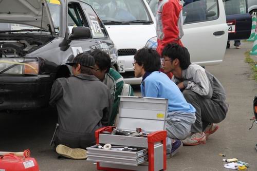 そ~です前に述べたチームがここなんです。 なぜこ~なったかの原因追求はしませんがきっとコースアウトを繰り返したに違いない・・・。 ま~何事も経験なのでこのようなトラブルにも対処できるようになろうね! だってこのチーム員は皆 “自動車整備士の卵”なんだから・・・ *本物の整備士もいるけど・・・。 ◆Jr16クラス(1600cc以下のNAエンジン搭載クラス)