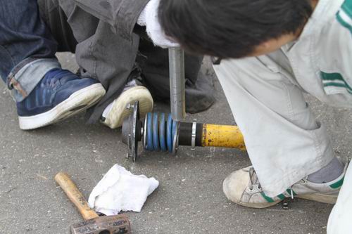 VTECエンジンはオイルが命・・ とでもいうのでしょか? カストロールオイルを追加中。 こちらは大人数でなにやら足回りを除いていますがなにがおきたのでしょう?