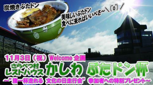 11月3日(祝日)の文化の日に開催する ”腹一杯走れる文化の日走行会(短縮名)”に参加される方または参加を予定している皆様にプレゼントを特別に用意してみました! なんと~・・・ サーキットユーザーご用達の豚丼が美味しいレストランとして有名な レストハウスかしわ さんのご協力で、11月3日(祝日)の走行会に参加してくれた方の中から数名に レストハウスかしわ特性 ”炭焼きぶたドン”をプレゼントします。 誰にどのようにプレゼントするのかはまだ決定していませんが、予定では・・・ ①コース別&駆動別にBESTタイム上位3名の方にプレゼントしようと考え中。 ②同じ人に当たると寂しいのでW受賞の方は外の方へプレゼントします。 ③プレゼントする ぶたドン の中身は受賞順位により変わる予定。例えば・・・ ・1番時計⇒ ぶたドン1杯 ・2番時計⇒ 半ぶたドン ・3番時計⇒ ぶたドンの肉1枚分? という感じでみんなに美味しい かしわのぶたドン を味わてほしいのでみんなで遊びに来てね! 詳細は決まり次第アップするので楽しみにしてね!