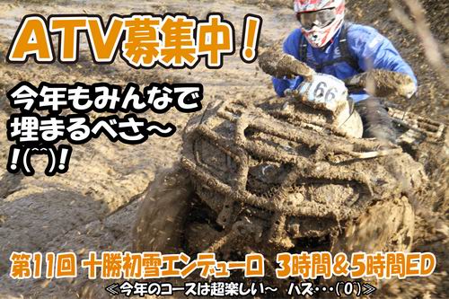 どこのコーナーかわかるかな? わかったら初雪ツウだぞ! と言う感じで只今急ピッチでエンデューロコースを整備中なので楽しみにしてね! ATVユーザー&まだエントリーしていないバイクユーザーの皆さんの参加申し込みを待っているよ~\(^o^)/ ビビんなよ(*^_^*) ・大会名称 第11回 十勝初雪エンデューロ 3時間ED&5時間ED ・開催日程 11月20日(日曜日)開催 ・申込期日 11月15日(火曜日)FAX申込
