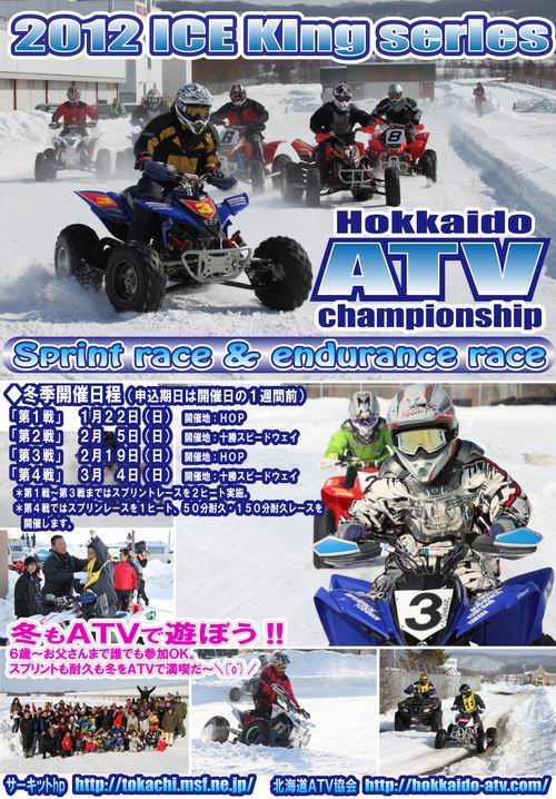 2012ICEKINGシリーズもいよいよ最終戦になります。 第3戦まで終了していますが参加者みなさんの成績はど~ですか? 「ICEKINGに王手だ~」という方もいると思うい、「最終戦で逆転だ~」と張り切っている選手もいる事でしょう。 なんにしても来週(3月4日開催)のATVイベントが 2012ICEKINGシリーズ の最終戦なのでみんなで遊びに来てね! あと、冬の耐久レースイベント も同日に開催するゾ! この耐久レースは チャンピオンシップ に参加していないATVライダーでも参加できる。 4WDだってOK! グリズリーにBRPの4WD系ATVもガンガン参加してください! 今回の耐久レースコースも零連通りに 2500m前後 の特設コースになるので走り応え満点! キッズ&奥様達も楽しむ事ができる 50分耐久 もあるので家族みんなで 3月4日(雛祭りの次の日) はサーキットでATVライフだ! ・開催日 3月4日(日曜日) *3月3日(土) ATV練習会開催 ・開催内容 ①チャンピオンシップ第4戦 (1ヒート) ②125cc以下のATV ≪50分耐久≫ ③126cc以上のATV ≪150分耐久≫ ATVライダーみんなが遊びに切る事を待ってるよ!