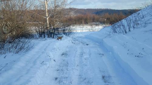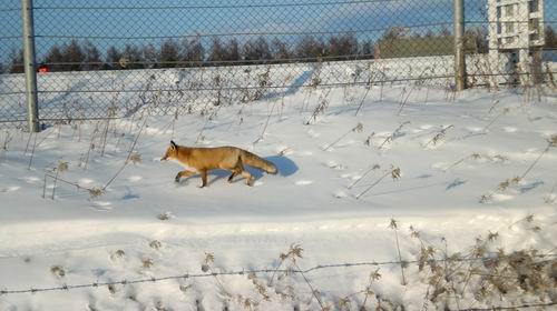 キツネ様が作業状況を視察中。 除雪車の速度に合わせて並走していたのですが、ど~してもコースレイアウトが気になったのかコースに入って来ました。