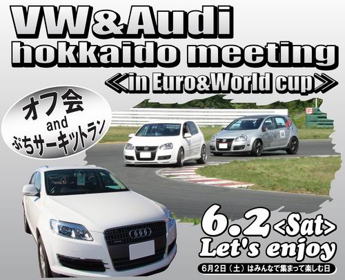 絶対に晴れるハズ・・・ いや晴れろ・・・ お願い晴れて・・・((+_+)) と神頼みをしたくなるイベントなのが、6月2日(土曜日)に開催する EURO&WORLDcup第2戦 だ! だって第1回大会は 大雨 にあたっちゃって、まともに走れせる事ができなかったから、第2回は是が非でも晴れて欲しいのさ。 第1回の走行風景はこんな感じ・・・大雨も大雨の大洪水警報でもでるんでないのかな? と思えるような大雨だったからもうこんな雨はいらない。 第2回のEURO&WORLDcupは晴れますように・・・(*^_^*) 6月2日(土曜日)のEURO&WORLDcupは VW&Audi北海道ミーティングと同時開催なので、開催スケジュールがチョットだけ変わっています。 ◆集合時間&場所 ・朝9時30分~10時00分 に メインパドックPIT に集合。 ◆走行スケジュール ・10時30分~12時30分 は CMコースを走行(25分x2回 / 2組) ・12時30分~13時00分 は VW&Audi体験走行会(ペースカー先導体験走行) ・13時30分~16時00分 は ジュニアコースを走行(15分x2~3回 / 3組) *VW&Audiミーティングの ちょい速体験走行会 も一緒に開催。(1回/3~4周) ・16時00分頃~ EURO&WORLDcup体験レースをジュニアコースで実施。 ・16時45分頃~ 閉会式&抽選会 ・17時00分頃~ 解散 絶対晴れるハズだから皆で遊びに来てね~\(^o^)/