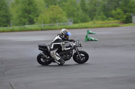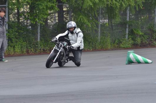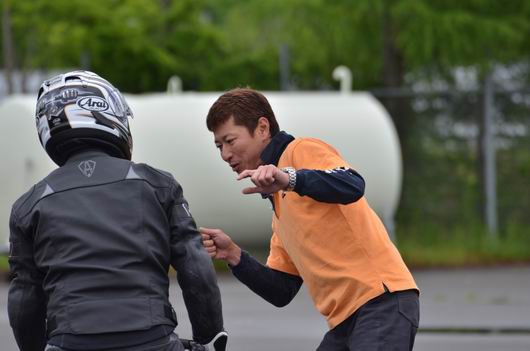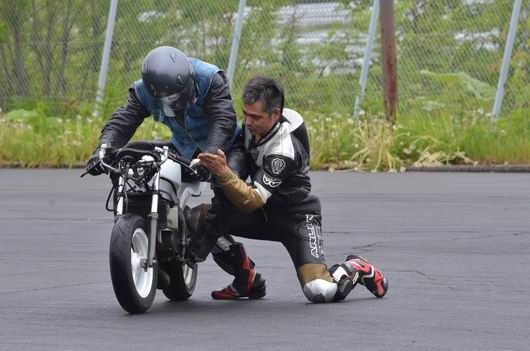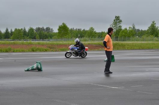 「膝を擦ってみない会」 同日開催した「ちょっと走ってみるベサー」(こちらは後で紹介します)に合わせ開催となりました。 昨年のバイクフェスティバルで好評を博したこのイベント。 当日は雲の予報だったのに、霧雨が降る生憎の天気。 午前中、クラブマンコースでは「バイク感謝DAY」が開催されており、いやなWET状態で走行を止める人が増える中、こちらのイベントは雨の中にも拘らず好評でした。 武石選手も受講者にアドバイスをしていました。担当スタッフも受講者は膝が擦れるようになるまでやるという意気込み。