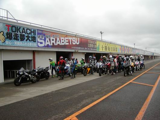 午後は「北海道サベダーpresentsちょっと走ってみるベサー」 多くの方が乗っているビッグバイク。ちょっとしたライディングミスが事故になりかねないぐらいのパワーがあります。 事故を起こさないためにも、一般道に比べ安全なサーキットでバイクの性能を知ってもらいライディングスキルをあげて欲しいと言う願いから開催されたイベント。 サーキットを走った事のない方に、安心して走って欲しいと多くのライダーとスタッフ、協力ショップのオーナーたちがボランティアでサポートしてくれました。最初はインストラクター先導でコースに慣れてもらい、その後フリー走行へ。 希望される方には引き続き先導走行も実施しました。 同時進行で武石選手と