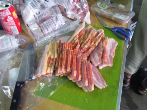 ブロックベーコンを男気サイズでカットして旨そうな事・・・ お肉は親方こだわりで かねひらのロースジンギスカン に決定。 このお肉はマジで美味い!! この美味しそうな材料を炭火で じゅ~ って焼くのがたまらんです。