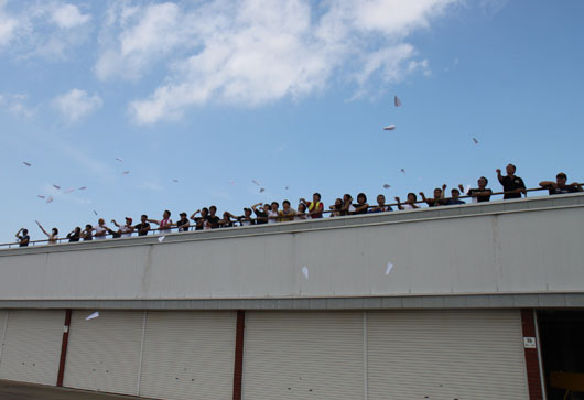 雨の予報が変わり、晴れたのは良いのですが暑い暑い。 9月のこの時期に「かき氷食べたいねぇ」なんて言う事はそう無いですよね。 さて、この走行会のメインは催しもの?で 昨年は雨で外で出来なかったからリベンジ。ピットの上からみんなで童心に戻り、紙飛行機を飛ばしてみました。