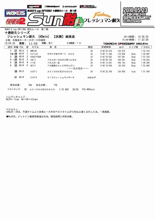 2010-05-23 フレッシュマン耐久第1戦の結果