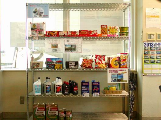 【エンジンオイル】や【計測機】をはじめ、【お菓子】や【カップ麺】、【テープ類】や【電池】、公式レース時には