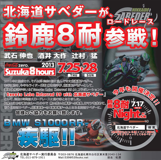 「みるベサー」の運営を手伝ってくれている『北海道サベダー』 今年も7月25~28日に開催される「コカコーラゼロ鈴鹿8時間耐久ロードレース」に参戦します。 ライダーは、「みるベサー」のマンツーマンレッスンで講師を務める 札幌出身プロライダー武石伸也選手。 チームは、「#39 Sweets Labo Motorrad 39 with 北海道サベダー」 マシンは「BMW S1000RR」 チームメイトは、酒井大作選手、辻村猛選手です。 詳しくは 北海道サベダーのHPで 8耐に向け、サーキットでトレーニングしているところ明日は、十勝ロードレース選手権シリーズ第2戦を開催! 8耐のテストで行ったり来たりと忙しい中、