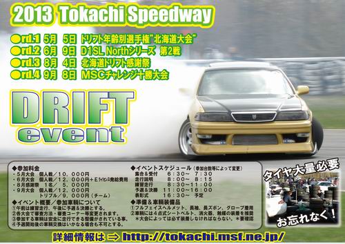 ドリフトユーザーの皆様、今週末には MSCチャレンジ北海道予選会 がある事を忘れていませんか? 只今エントリーを受付中なので「あ~忘れてたー」 という方は大至急電話(0155-52-3910)してくださいね! そして今回の大会で入賞した選手にはなんと・・・ 賞金 がでるという事です! 賞金の内容は MSC事務局 に聞いて頂くとしてみんなで参加してね! ◆開催日程 9月8日(日曜日) 集合(朝6時30分~7時30分頃) ◆クラス分 ①EX ②ミドル ③ビギナー ④トリプル(EX参加者のみ) ◆申込期日 9月6日(金曜日)まで電話で申込OK ☎0155-52-3910 ===================================== ===================================== ドリフトユーザーのみなさんには DMハガキ を送付したのでもう認識してると思うけど、Netユーザーにも告知しておこう! 9月8日(日曜日)に ドリフト大会の MSCチャレンジ北海道予選 を十勝スピードウェイのジュニアコースで開催しますよ! 只今、参加受付中なのでサーキットまで電話してね! そして今回は、前日に練習走行時間を設けましたよ! 練習時間は 9月7日(土曜日) 13時頃~16時30分頃 までを予定しています。 練習走行料金は 9000円 です。 *MSCチャレンジ参加者は当日参加料金を4000円offにしますので、練習料は5000円相当になる。 練習走行日には MSCスタッフ もコース設営準備に来場するのでもしかしたら本番当日のコース説明や攻略法? なんかも聞けるかも・・・(わかんないけど)。 サーキットで行うドリフト大会はこの MSCチャレンジ で終了なので、みんなで参加してね!