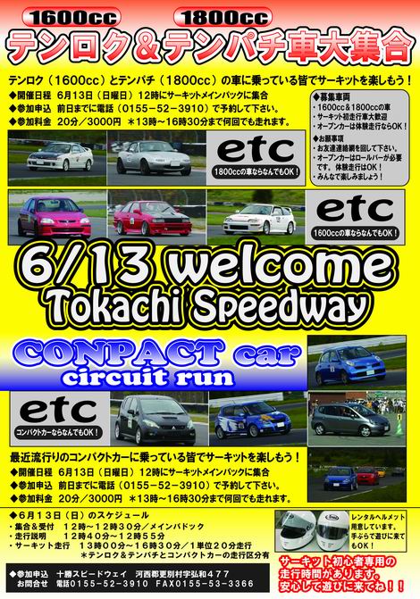 こんな企画を開催しますよ! テンロク(1600cc)&テンパチ(1800cc)のクルマに乗っている方々大募集! そして、最近勢力図を伸ばしてきた ”コンパクトカー(ヴィッツ、フィット、コルト、マーチ、etc)”に乗っている方々も一緒に大募集だ! ・開催日時 6月13日(日曜日) 12時~12時30分 にサーキットに集合&受付 ・参加料金 20分/3000円 *希望者は何回でも走る事ができます。 ・参加方法 前日までに電話(0155-52-3910)で申し込んでください。 ・イベント ①13:00~16:30までサーキットを走る事ができます。 ②テンロク&テンパチ、コンパクトカーの区分で走行します。 ③初めて走る方専用の走行時間を設けます。 ④ペースカーと一緒に走る ”サーキット体験走行”もできます。 *家族、友達も同乗する事ができます。 後ほどイベント詳細を 【インフォメーション】 にアップするので確認してね! 6月13日(日)はサーキットに遊びに来てね!懐かしのCR-Xもガンガン遊びに来てね!!