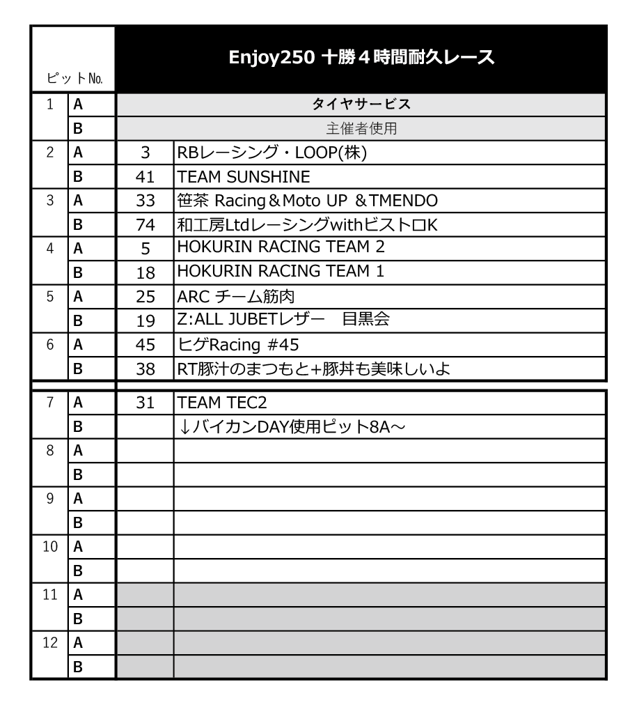 ●各チーム 3回以上のピットイン義務(給油も回数に含む/ライダー交代のみは停止時間規定なし)